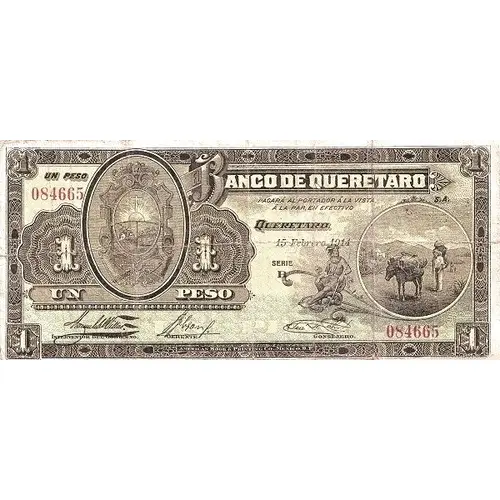 | Obverse lettering | UN PESO EL BANCO DE QUERETARO PAGARÁ AL PORTADOR Á LA VISTA A LA PAR, EN EFECTIVO QUERETARO 15 Febrero 1914 (Translation: One Peso The Bank of Queretaro will pay to the bearer on sight at par, in cash. 15 February 1914) |