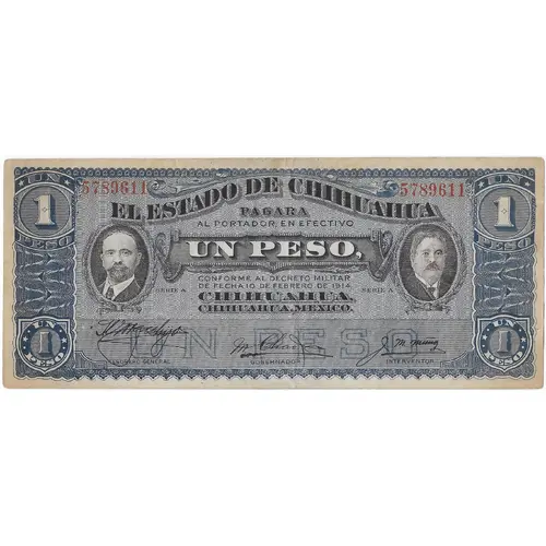 EL ESTADO DE CHIHUAHUA PAGARA AL PORTADOR EN EFECTIVO UN PESO, CONFORME AL DECRETO MILITAR DE FECHA 10 DE FEBRERO DE 1914 CHIHUAHUA, CHIHUAHUA, MEXICO. UN PESO (Translation: The State of Chihuahua will pay to the bearer in cash One Peso according to the military decree dated 10 February 1914) |
