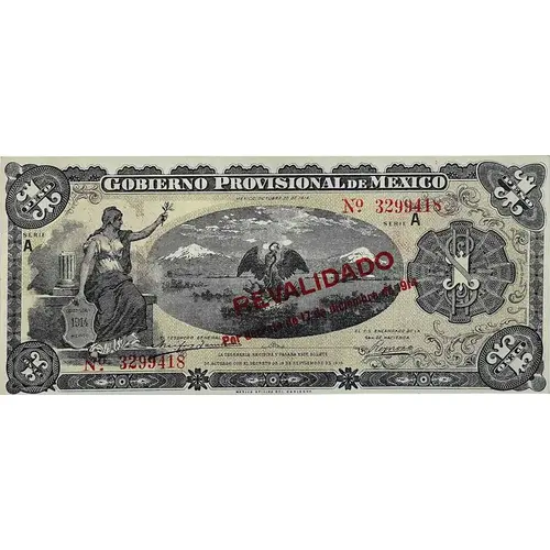 Seated Liberty on left holding a plaque in her right hand and an olive branch in her left hand. At centre, an eagle with a snake in it`s beak perched on a cactus, with a background of a lake with 2 volcanos, Popocatepetl and Ixtaccihuatl. Red serial number at upper right. Flat bottom 1s in corners. Black on light brown underprint. |