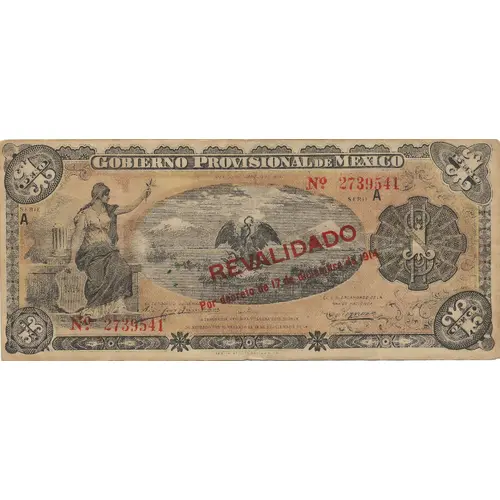 GOBIERNO PROVISIONAL DE MEXICO MEXICO, OCTUBRE 20 de 1914 LA TESORERIA RECIBIRA Y PAGARA ESTE BILLETE DE ACUERDO CON EL DECRETO DE 10 DE SEPTIEMBRE DE 1914. MEXICO OFICINA DEL GOBIERNO (Translation: Provisional Government of Mexico Mexico, October 20, 1914 The treasury will receive and pay this bill in accordance with the decree of 10 September 1914 Mexico Office of the Government) |