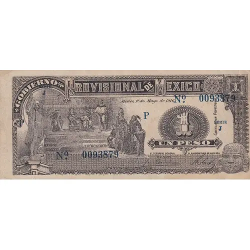 | Надписи лицевой стороны | Gobierno Provisional de Mexico México, 1º de Mayo de 1916. Circulacion Provisional Un Peso (Translation: Provisional Government of Mexico Mexico, 1st of May, 1916. Provisional Circulation One Peso) |