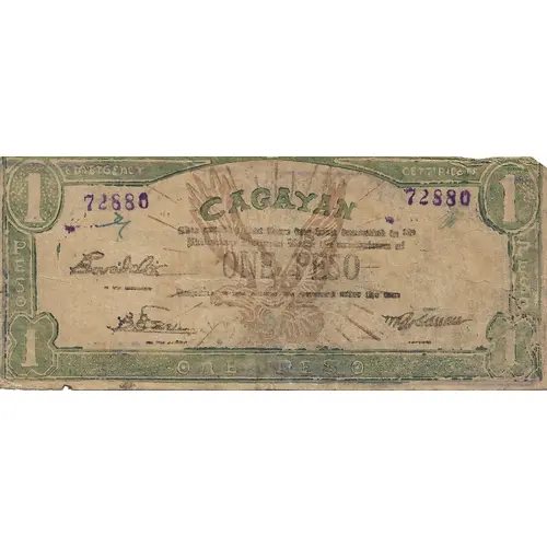 1 EMERGENCY CERTIFICATE 1 CAGAYAN PESO PESO 1 ONE PESO 1 THIS CERTIFIES THAT THERE HAS BEEN DEPOSITED IN THE PHILIPPINES NATIONAL BANK THE EQUIVALENT OF ONE PESO PAYABLE TO THE BEARER ON DEMAND AFTER THE WAR ONE PESO |