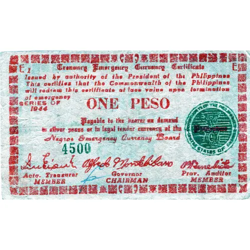 TREASURY EMERGENCY CURRENCY CERTIFICATE ISSUED BY AUTHORITY OF THE PRESIDENT OF THE PHILIPPINES THIS CERTIFIES THAT THE COMMONWEALTH OF THE PHILIPPINES WILL REDEEM THIS CERTIFICATE AT FACE VALUE UPON TERMINATION OF EMERGENCY ONE PESO PAYABLE TO THE BEARER ON DEMAND IN SILVER PESOS OR IN LEGAL TENDER CURRENCY OF THE PHILIPPINES NEGROS EMERGENCY CURRENCY BOARD |