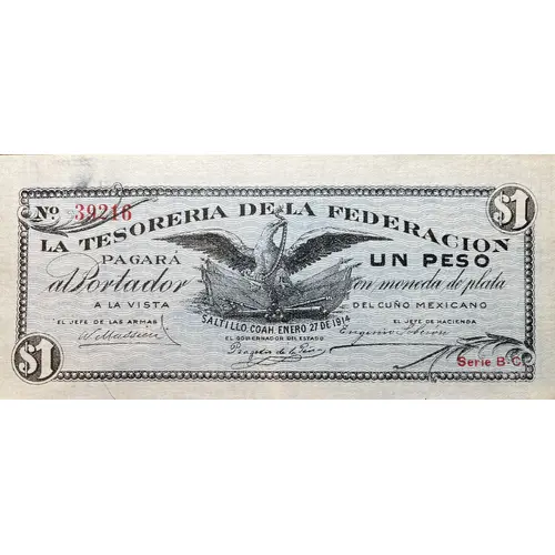 Este billete es de circulacion forzosa en todo el Estados Saltillo, Coah. Enero 27 de 1914 |