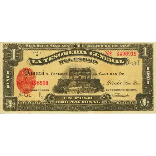 | Obverse lettering | REPUBLICA MEXICANA ESTADO DE YUCATAN LA TESORERIA GENERAL DEL ESTADO Pagará Al Portador La Cantidad De UN PESO ORO NACIONAL Mérida, Yuc., Mex. (Translation: Mexican Republic State of Yucatan The general treasury of the state will pay the bearer the amount of One Peso in national gold. Merida, Yucatan, Mexico) |