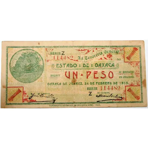 | Obverse lettering | La tesoreria General del ESTADO DE OAXACA Pagara UN PESO al portador en efectivo OAXACA DE JUAREZ, 24 DE FEBRERO DE 1915 (Translation: The General Treasury of the State of Oaxaca will pay One Pesos to the bearer in cash Oaxaca de Juarez, 24 February 1915) |