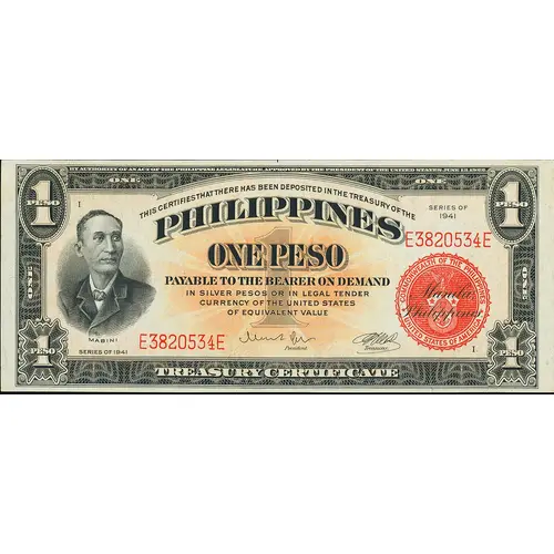 BY AUTHORITY OF AN ACT OF THE PHILIPPINE LEGISTATURE APPROVED BY THE PRESIDENT OF THE UNITED STATES JUNE 13, 1922 THIS CERTIFIES THAT THERE HAVE BEEN DEPOSITED IN THE TREASURY OT THE PHILIPPINES ONE PESO PAYABLE TO THE BEARER ON DEMAND IN SILVER PESOS OR IN LEGAL TENDER CURRENCY OF THE UNITED STATES OF EQUIVALENT VALUE SERIES OF 1941 MABINI TREASURY CERTIFICATE |