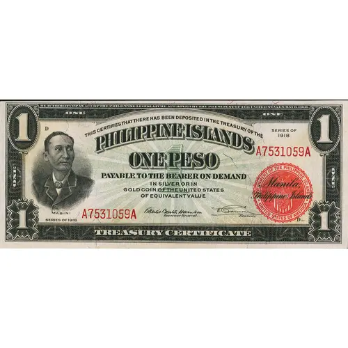 | Obverse lettering | BY AUTHORITY OF AN ACT OF THE PHILIPPINE LEGISTATURE, APPROVED BY THE PRESIDENT OF THE UNITED STATES MAY 6, 1918 ONE ONE THIS CERTIFIES THAT THERE HAVE BEEN DEPOSITED IN THE TREASURY OT THE PHILIPPINE ISLANDS ONE PESO PAYABLE TO THE BEARER IN SILVER PESOS OR IN GOLD COIN OF THE UNITED STATES OF EGUIVALENT VALUE MABINI TREASURY CERTIFICATE |