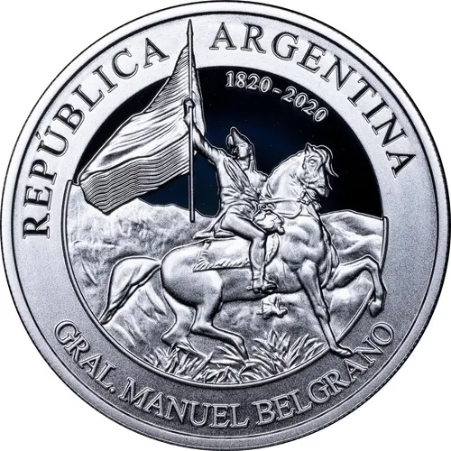 Obverse description The main figure on the obverse is based on the equestrian sculpture by Manuel Belgrano, located in the Plaza de Mayo. In its right angle, the inscription `1820-2020` represents the 200 years of the commemoration of the Passage to Immortality of General Manuel Belgrano. The upper arch reads “REPÚBLICA ARGENTINA” and the lower arch, “GRAL. MANUEL BELGRANO ”.
