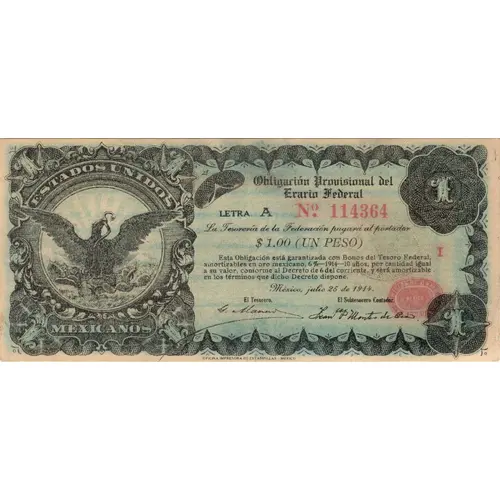 | Obverse lettering | ESTADOS UNIDOS DE MEXICO Obligacion Provisional del Erario Federal Letra A La tesoreria de la Federacion pagara al portador $1.00 (UN PESO) Esta obligacion esta garantizada con bonos del tesoro Federal amortizable en oro mexicano, 6%-1914-10 anos, por cantidad igual a su valor, conforme al decreto de 6 del corriente y sera amortizable en los terminos que dicho Decreto dispone. Mexico julio 25 de 1914. (Translation: United States of Mexico Provisional Obligation of the Federal Treasury The treasury of the Federation will pay the bearer $1.00 (ONE PESO) This obligation is guaranteed with Federal Treasury bonds redeemable in Mexican gold, 6%-1914-10 years, for an amount equal to its value, in accordance with the decree of 6 of the current and will be redeemable in the terms that said Decree provides. Mexico July 25, 1914.) |