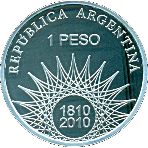 | Obverse description | We see the representation of the rising sun as a symbol of our country in constant growth; Evokes the 200 years of the May Revolution with the inscription of the years `1810 - 2010`. In the upper arch you can see `REPÚBLICA ARGENTINA` and below the face value `1 PESO`. |