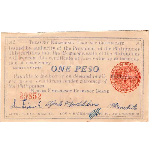 TREASURY EMERGENCY CURRENCY CERTIFICATE ISSUED BY AUTHORITY OF THE PRESIDENT OF THE PHILIPPINES THIS CERTIFIES THAT THE COMMONWEALTH OF THE PHILIPPINES WILL REDEEM THIS CERTIFICATE AT FACE VALUE UPON TERMINATION OF EMERGENCY ONE PESO PAYABLE TO THE BEARER ON DEMAND IN SILVER PESOS OR IN LEGAL TENDER CURRENCY OF THE PHILIPPINES NEGROS EMERGENCY CURRENCY BOARD |