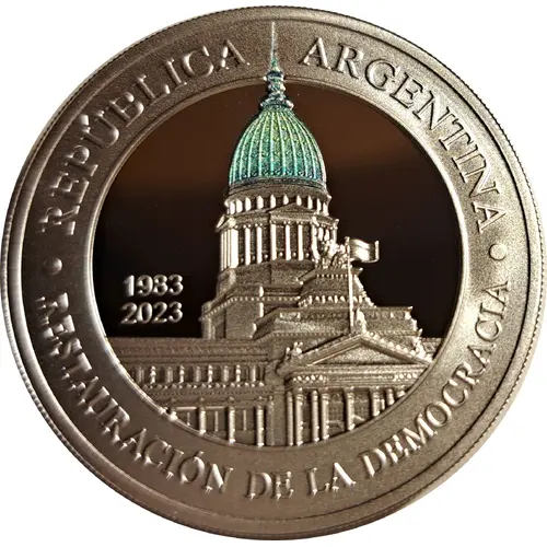 | Obverse description | It presents in its center an image of the Palace of the National Congress, with the detail of that distinctive green color on the imposing dome of the building, a color that its copper coating acquired due to the action of time and contact with the air. Next to the building, it reads 1983, the date it is commemorated, and 2023, the year of minting. In the upper arch it reads “ARGENTINE REPUBLIC”, and in the lower one, “RESTORATION OF DEMOCRACY”. |