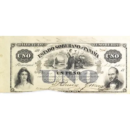 | Obverse lettering | BILLETE DE TESORERIA ESTADO SOBERANO de PANAMA UNO UNO PANAMA 12 de Octubre de 1869 Vale por UN PESO de recibo en la décima parte de toda contribución a favor del Tesoro del Estado LEI 17ª DE 1865 (Translation: Treasury note Sovereign State of Panama one one Panama October 12th., 1869 Valid for one Peso received on tenth part of all contribution to State Treasury Law 17th. of 1865) |