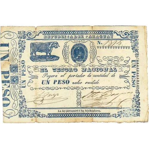 | Obverse lettering | REPUBLICA DEL PARAGUAY EL TESORO NACIONAL El Tesoro Nacional pagará al portador la cantidad de UN PESO valor recibido. La Ley perseguirá á los falsificadores y sus cómplices. (Translation: Republic of Paraguay The national Treasure will pay to the bearer the amount of One Peso, received value. The law will prosecute the counterfeiters and their accomplices.) |