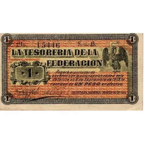 | Obverse lettering | LA TESORERIA DE LA FEDERACION GUAYMAS, SONORA (Translation: The Treasury of the Federation Guaymas, Sonora) |