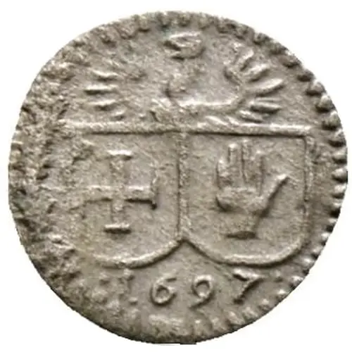 | Obverse description | Two-divided coat of arms, cross in left, hand in right, one-headed eagle above, year below |