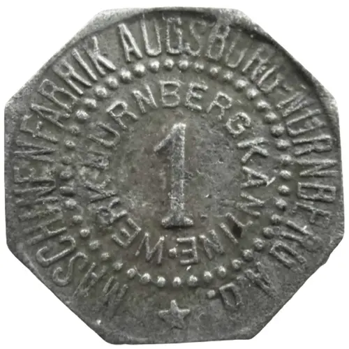 | Obverse lettering | MASCHINENFABRIK AUGSBURG-NÜRNBERG A.G. ★ WERK NÜRNBERG KANTINE ● 1 |