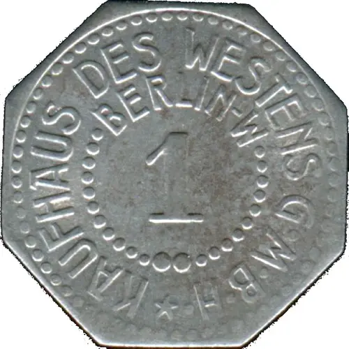 | Obverse lettering | KAUFHAUS DES WESTENS G•M•B•H• BERLIN-W 1 ✭ |