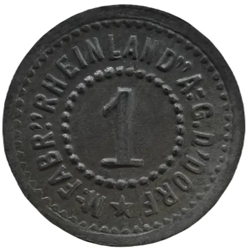 | Obverse lettering | M.- FABR. `RHEINLAND` A.-G. D`DORF ★ 1 |