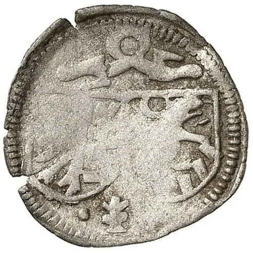 | Obverse description | 2 adjacent shields of arms suspended from looped hanger, 2-fold arms on left, bear on wall in Aschersleben arms on right. Lily below. |