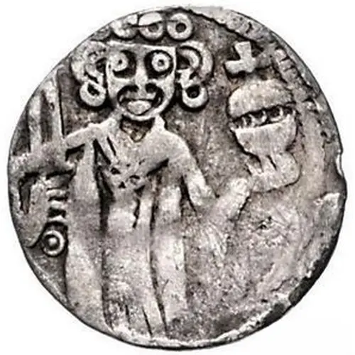| Reverse description | Facing bust under three arches with a tower and two cross flags. |