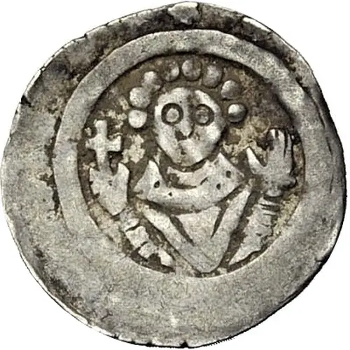 | Obverse description | Half-length figure holding both hands in the air with a cross in the right hand. |