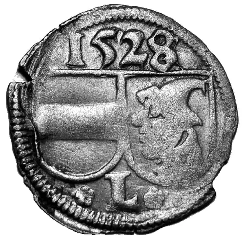 Aversbeschreibung 2 adjacent shields of arms, Leuchtenberg and hatted head left, date above, `L` below.