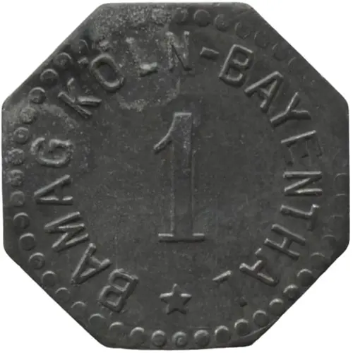 Artistry: The design of this 1 Pfennig piece, typical of many Notgeld issues, prioritizes legibility and functionality over elaborate artistic expression. An engraver is not recorded, reflecting the rapid, utilitarian production methods employed during this crisis period. Stylistically, it falls within the pragmatic school of emergency coinage, characterized by clear denominational markings, the issuer's name, and often a simplified motif. For this specific coin, the design would likely feature the value "1 Pfennig" prominently, along with "Stadt Köln" or "Köln-Bayenthal Bamag," conveying its essential purpose without decorative flourishes, a direct response to urgent economic need.