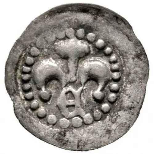 Opis awersu Lilly above gothic letter E within beaded circle.