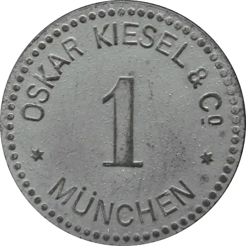 Historical Context: This 1 Pfennig coin, issued by Oskar Kiesel and Cº in Munich, belongs to the significant numismatic category of Notgeld, or emergency money. While the specific year is not provided, its composition of nickel-plated zinc strongly places it within the period of economic turmoil in Germany, likely during or immediately following World War I (circa 1914-1923). During this era, severe shortages of official coinage metals and rampant inflation led municipalities and private enterprises, such as Oskar Kiesel and Cº, to issue their own localized currency to facilitate commerce. This coin thus represents a fascinating chapter in German monetary history, reflecting a decentralized response to national economic instability.