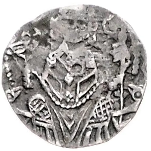 Obverse description Facing seated bishop with crozier and imperial orb.