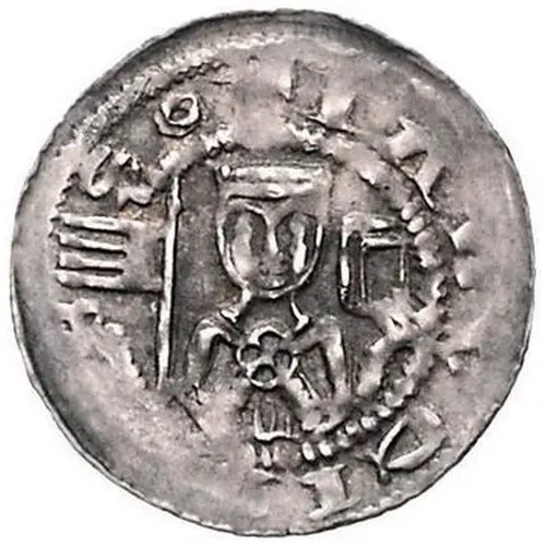 | Ön yüz açıklaması | Half-length facing female figure wearing crownlike hat, holding a flag and a book, on the chest a fibula holding the mantle in the shape of a 4-petalled rosette. |