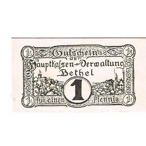 | Obverse lettering | Gutschein der Hauptkassen-Verwaltung Bethel für einen Pfennig |