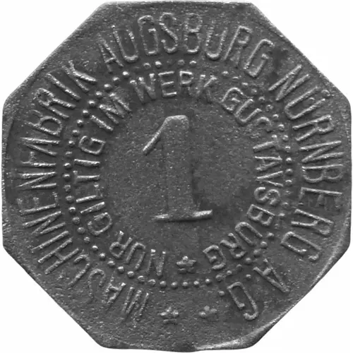 | Obverse lettering | MASCHINENFABRIK AUGSBURG-NÜRNBERG A.G. ❀ ❀ NUR GILTIG IM WERK GUSTAVSBURG ❀ 1 |
