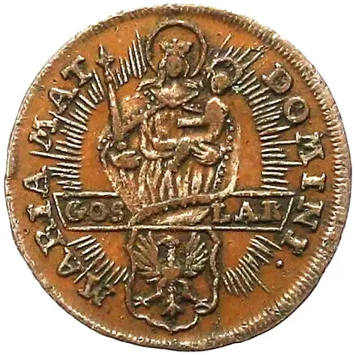 | Obverse description | Madonna in rays, divides GOS-LAR, city arms below. |