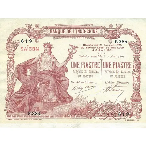 BANQUE DE L`INDO-CHINE HAïPHONG DÉCRETS DU 21 JANVIER 1875 ET DU FÉVRIER 1888, 16 MAI 1900 & 3 AVRIL 1903 EMISSION AUTORISÉE LE 3 AOÛT 1891 UNE PIASTRE PAYABLE EN ESPÈCES AU PORTER UN ADMINISTRATEUR : UNE PIASTRE PAYABLE EN ESPÈCES AU PORTER LE DIRECTEUR : DANIEL DEPUIS ET GEORGES DUVAL FEC. LEVEILLE SC |