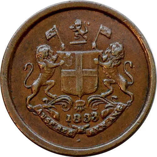 | Obverse description | Coat of arms of the East India Company On the ribbon is the legend: Auspicio Regis Et Senatus Anglia, date below, value (Pie) above - all within a plain raised rim. |