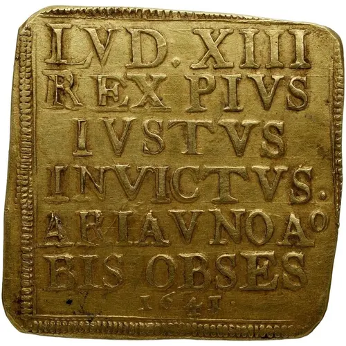LVD.XIII REX PIVS IVSTVS INVICTVS ARIAV NOA BIS OBSES 1641 (Translation: Louis XIII, pious and just king, undefeated in the besieged city of Aire.) |