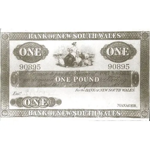 Obverse lettering BANK OF NEW SOUTH WALES ONE ONE A Promis to pay the Bearer at PORT MORESBY on demand ONE POUND Sterling. Dated the ____ day of ____ 19 For the BANK OF NEW SOUTH WALES. ONE Manager BANK OF NEW SOUTH WALES.