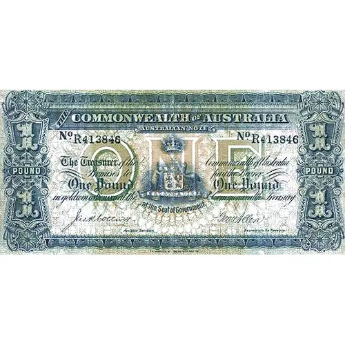 THE COMMONWEALTH OF AUSTRALIA AUSTRALIAN NOTE The Treasurer of the Commonwealth of Australia Promise to pay the Bearer One Pound One Pound in gold coin ON DEMAND at the Commonwealth Treasury at the Seat of Government. T. S. HARRISON AUSTRALIAN NOTE PRINTER 1 POUND 1 |