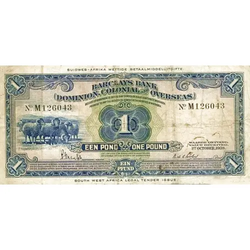 SUIDWES-AFRIKA WETTIGE BETAALMIDDELUITGIFTE BARCLAYS BANK (DOMINION, COLONIAL AND OVERSEAS) EEN POND ONE POUND EIN PFUND SOUT WEST AFRICA LEGAL TENDER ISSUE |