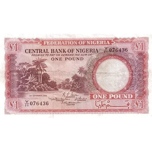 | Vorderseitenlegende | Federation of Nigeria Central Bank of Nigeria Promise to pay on demand the sum of One Pound |