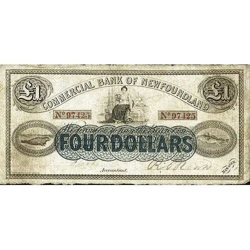 | Obverse lettering | 1£ 1£ COMMERCIAL BANK OF NEWFOUNDLAND FOURDOLLARS We promise to pay the Bearer on Demand ONE POUND Currency in SPECIE. SAINT JOHNS. 1st Jan / 1874 |
