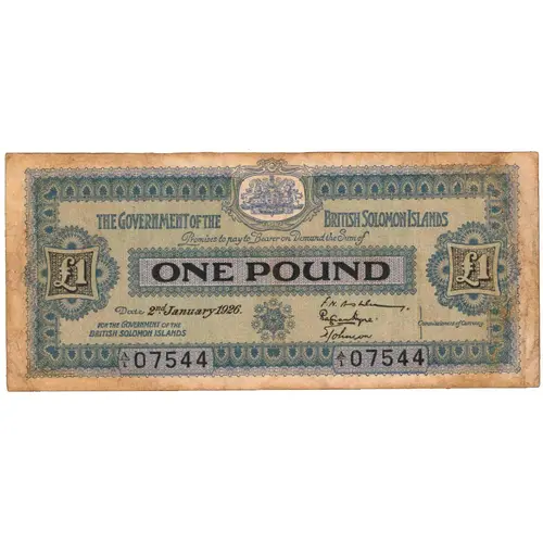 | Obverse lettering | THE GOVERNMENT OF THE BRITISH SOLOMON ISLANDS PROMISES TO PAY THE BEARER ON DEMAND THE SUM OF ONE POUND |