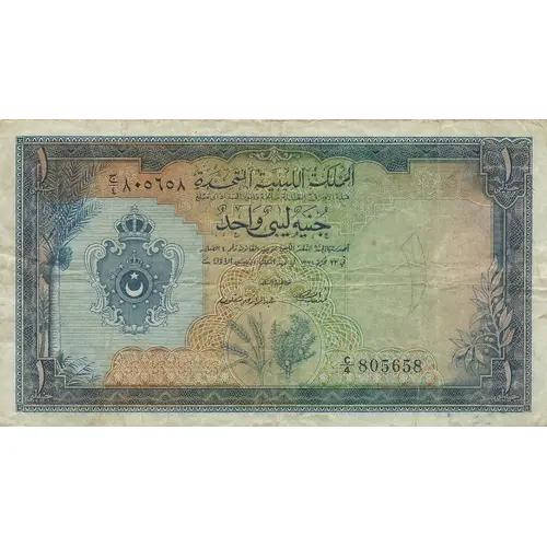 | Obverse lettering | UNITED KINGDOM OF LIBYA THESE CURRENCY NOTES AR LEGAL TENDER FOR THE PAYMENT OF ANY AMOUNT ONE LIBYAN POUND ISSUED BY THE LIBYAN CURRENCY COMMISSION IN ACCORDANCE WITH LAW NO.4 OF 24TH OCTOBER, 1951, IN THE REIGN OF KING IDRIS I. |