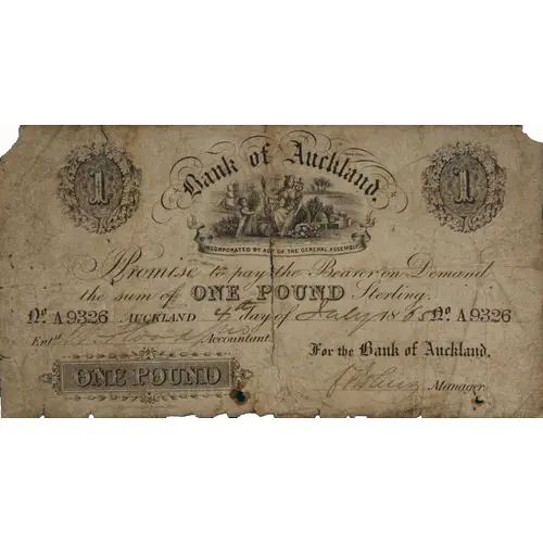 BANK OF AUCKLAND 1 1 INCORPORATED BY ACT OF THE GENERAL ASSEMBLY PROMISE TO PAY THE BEARER ON DEMAND THE SUM OF ONE POUND STERLING AUCKLAND FOR THE BANK OF AUCKLAND ONE POUND |