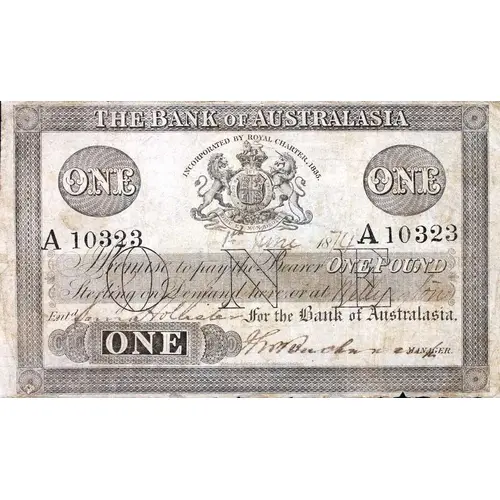 | Obverse lettering | THE BANK OF AUSTRALASIA INCORPORATED BY ROYAL CHARTER, 1835. ONE ONE PROMISE TO PAY THE BEARER ONE POUND STERLING ON DEMAND HERE OR AT WELLINGTON FOR THE BANK OF AUSTRALASIA ONE |