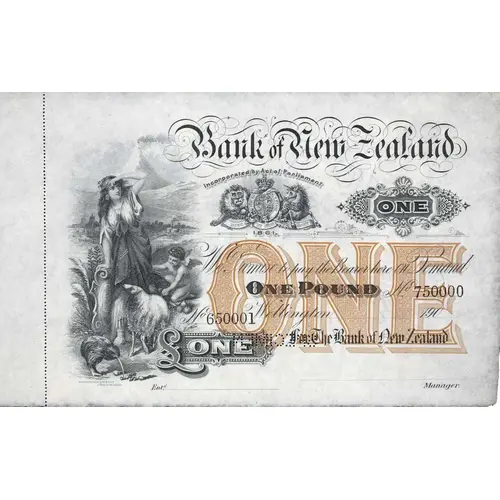 BANK OF NEW ZEALAND INCORPORATED BY ACT OF PARLIAMENT ONE WE PROMISE TO PAY THE BEARER HERE ON DEMAND ONE POUND FOR THE BANK OF NEW ZEALAND ONE ONE |