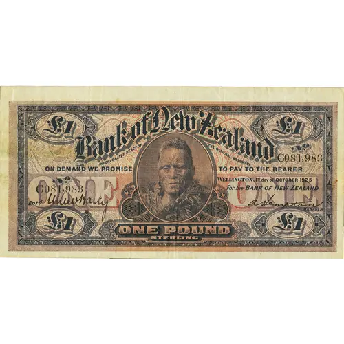 BANK OF NEW ZEALAND INCORPORATED BY ACT OF THE GENERAL ASSEMBLY ON DEMAND WE PROMISE TO PAY THE BEARER ONE ONE WELLINGTON FOR THE BANK OF NEW ZEALAND ONE POUND STERLING |